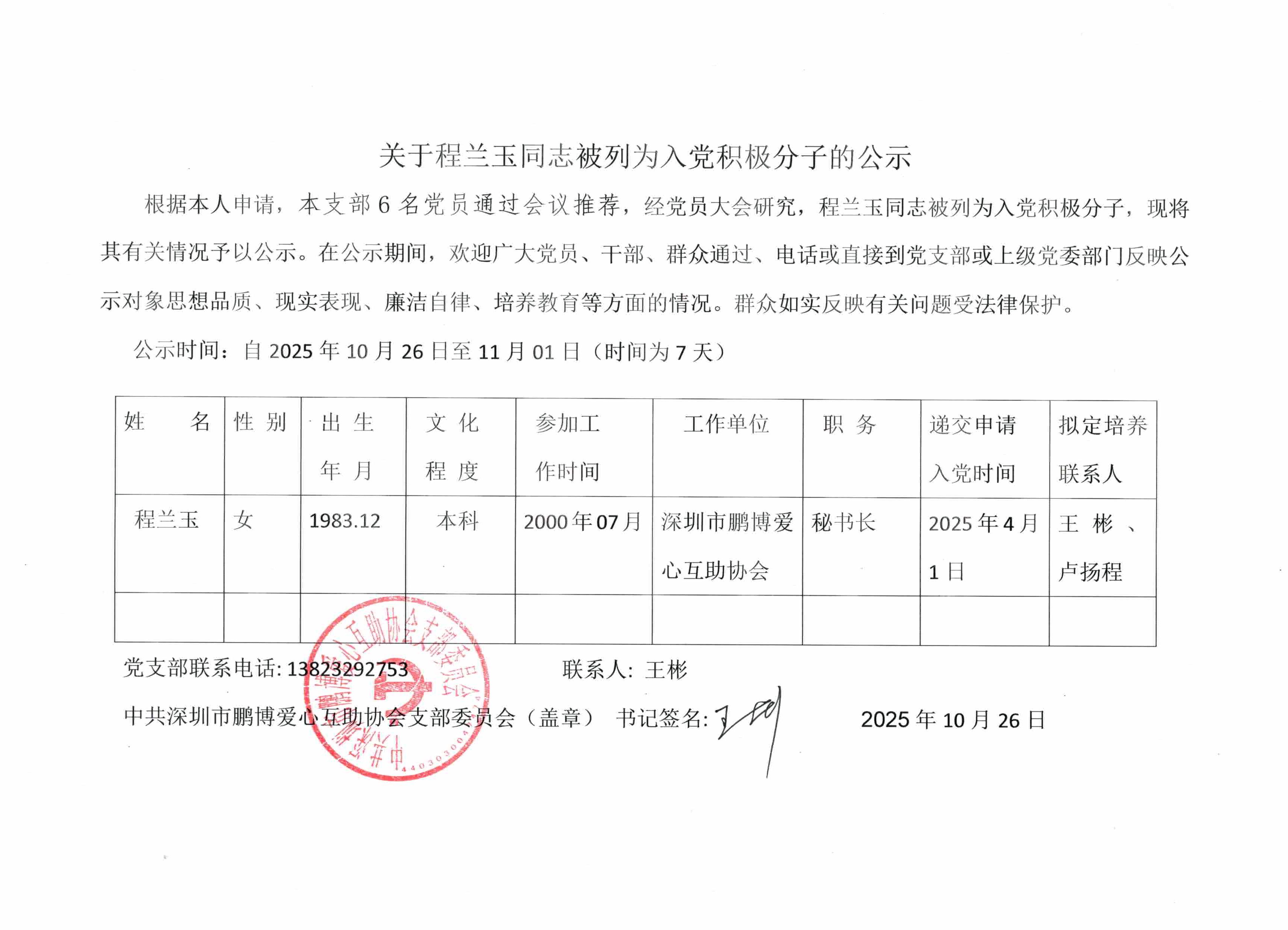 根据本人申请,本支部6名党员通过会议推荐,经党员大会研究,程兰玉同志被列为入党积极分子,现将其有关情况予以公示。在公示期间,欢迎广大党员、干部、群众通过、电话或直接到党支部或上级党委部门反映公示对象思想品质、现实表现、廉洁自律、培养教育等方面的情况。群众如实反映有关问题受法律保护。